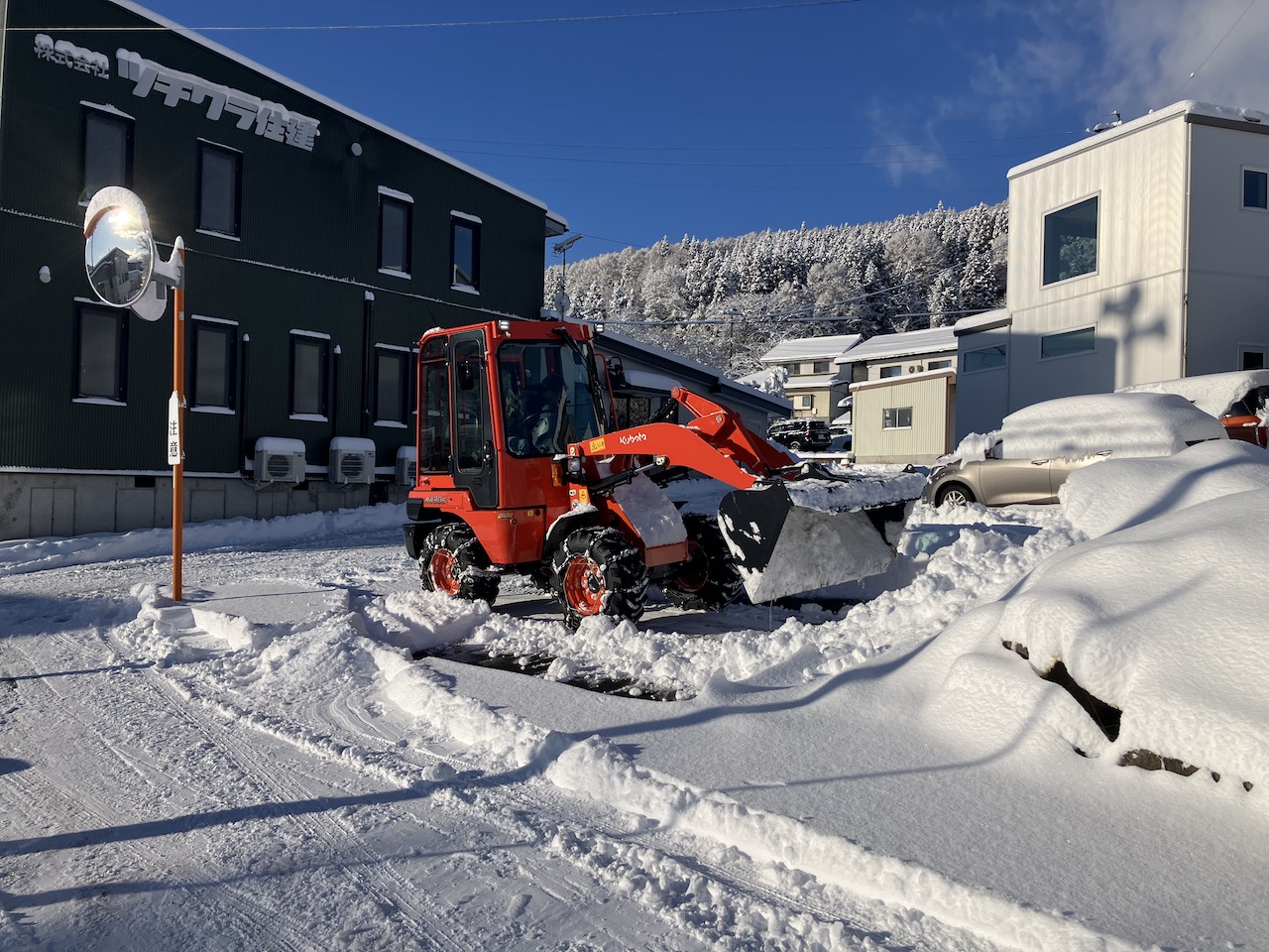 昨夜からの雪が結構積もりました。加えて今日は祝日です。ホイルローダで除雪の練習をするにはうってつけの日ということで、8時ごろからやろうと思って外に出たところ、なんと先を越されました。エクステリア担当の伊藤君が既に従業員駐車場の大半の除雪を終えておりました。経験長いこともあり、やはり上手です。作業を見ていても不安感がありません。これから時々私が練習したとしても、あそこまでのレベルになるのは無理かもしれません。伊藤君にしてみれば、私がやることなど危なっかしくて見ていられないのでしょう。ここはおとなしくということで、除雪の邪魔にならないように、会社の車を除雪したところに動かす補助業務に専念しました。