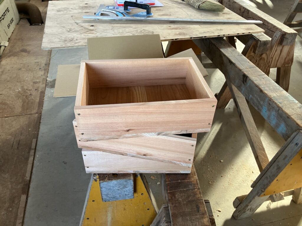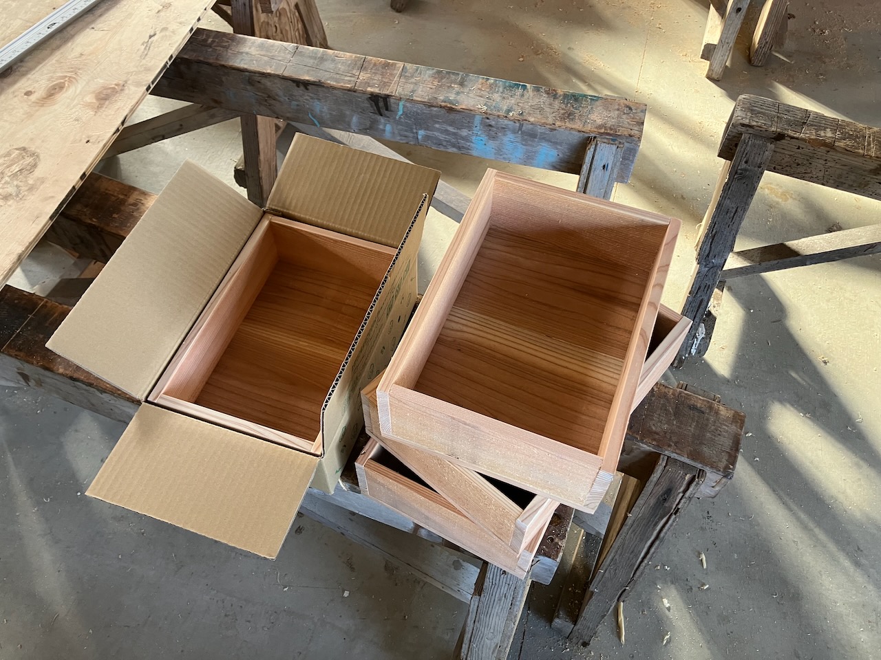 金曜日にベテラン大工の高橋さんにお願いした小さな仕事なんですが、今日たまたま作業場に寄ったところ出来上がっておりました。見たところタダの箱ですが、実際のところもタダの箱で、10数ミリの板を単純にビス止めで組み立てたものです。簡単そうに見えますが、我々素人がこれをやろうとするとなかなか大変です。以前孫にミニカー用の棚を作ってあげたときも、板厚20ミリもあったのに1箇所ビスの先端が飛び出てしまって大変でした。