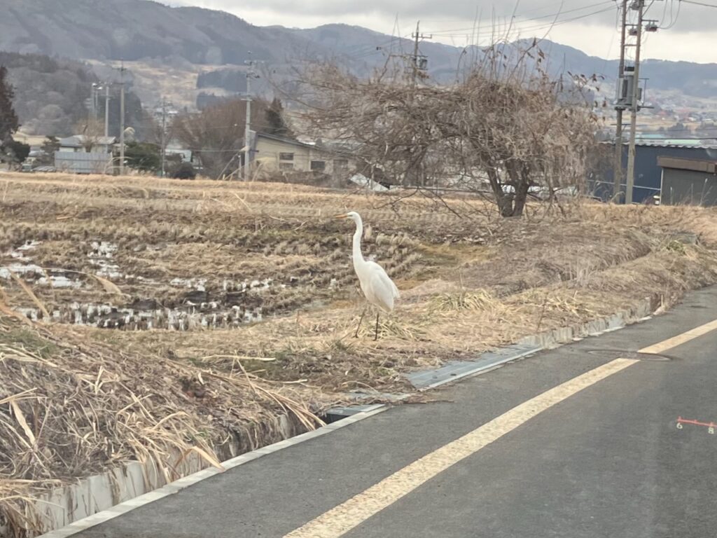 あと、これは季節関係ないかもしれませんが、車で走っていたところ白サギがスッと立っておりまして、特に逃げる様子もないので車を止めて撮影。あとで調べたら白サギっていうのは俗称で、コサギ、チュウサギ、ダイサギとまさに大中小がいるみたいですね。今回見つけたのは結構大型だったので、ダイサギってことなんでしょうか?